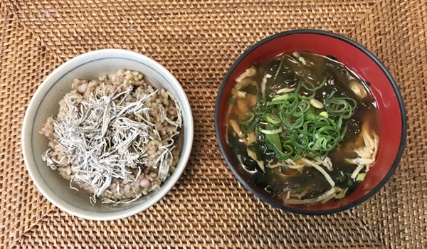 朝:若玄米雑穀しらすごはん・みそ汁・浅漬け