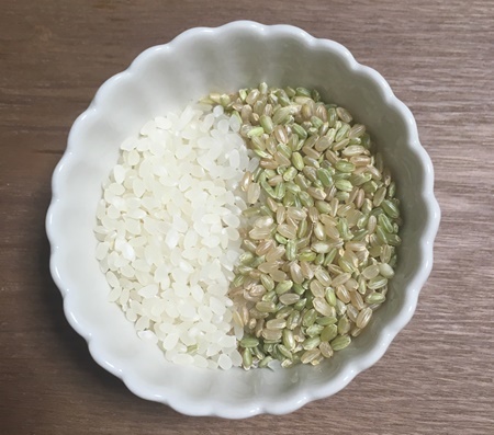 白米と若玄米を半分ずつブレンドして炊きます